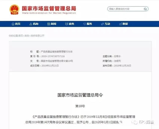 ????????11月26日,国家市场监督管理总局发布《产品质量监督抽查管理暂行办法》,将自2020年1月1日起施行。《办法》共56条,明确了监督抽查的组织、抽样、检验、异议处理、结果处理及相关人员应承担的法律责任,对于加强产品质量监督管理、规范产品质量监督抽查工作、保护消费者的合法权益有重要意义。