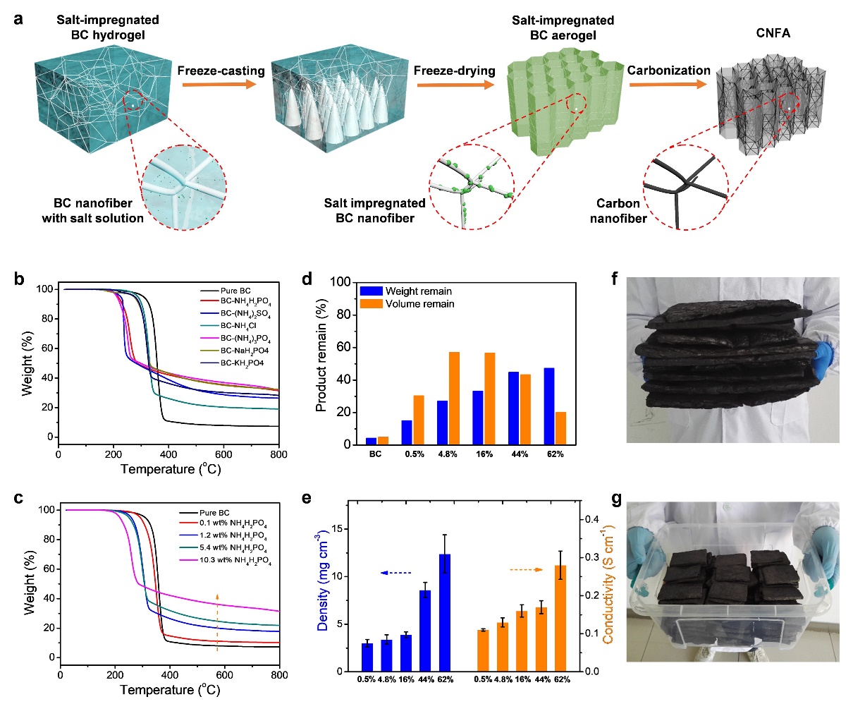 ????????图1、宏观尺寸CNFAs的合成。(a)CNFAs制造工艺示意图;(b)纯BC和BC浸渍NH4H2PO4、(NH4)2SO4、NH4Cl、(NH4)3PO4、NaH2PO4或KH2PO4的TG曲线;(c)纯BC和BC浸渍不同浓度NH4H2PO4后的TG曲线;(d)以纯BC和BC为原料,在800°C下加入不同量的NH4H2PO4炭化制备CNFAs(NH4H2PO4的重量比分别为0.5、4.8、16、44和62 wt%);(e)1200 ℃下制备的CNFAs的密度和导电性;(f ~g)在800℃下制备的CNFAs照片,展示了其可以大规模制备。