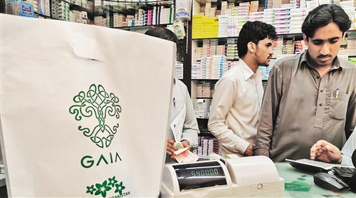 ????????巴基斯坦政府日前颁布“禁塑令”,首都伊斯兰堡全面禁止使用一次性不可降解塑料袋,违反者将受到严厉处罚。旁遮普省、信德省等地也将很快实施类似法规。图为药店提供的收费环保袋。