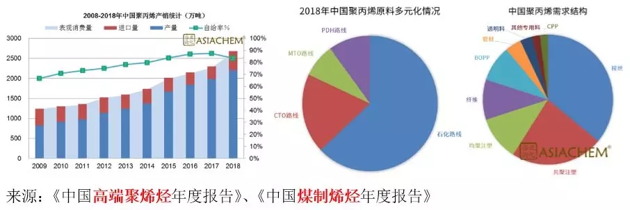 ????????聚丙烯(PP)是需求量最大的通用聚烯烃(PO)产品之一,在全球的消费量仅次于聚乙烯(PE)。中国是PP生产和消费大国。亚化咨询数据显示,截至2018年底中国已建成投产PP产能约2400万吨/年,并且形成了石化、煤化工(CTO/MTO/MTP)、丙烷脱氢(PDH)等原料路线多元化发展的趋势。中国PP需求量呈现稳定增长,2018年表观消费量约2600万吨,供需缺口近400万吨。中国PP主要消费领域是拉丝、注塑和纤维等,应用于包装、电子、与家电、汽车、纤维、建筑管材等领域。