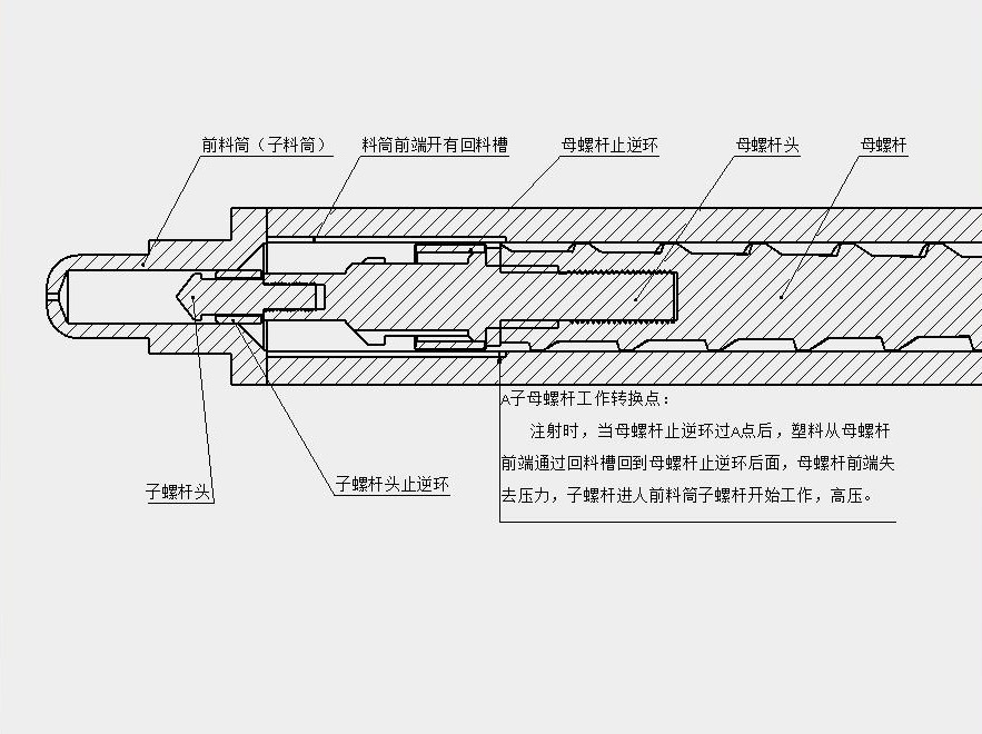 ????????注塑机根据产品的大小加足相应的原料,加料结束后,开始注射,螺杆向前运动,母螺杆头上的母止逆环及子螺杆头上的子止逆环滑向后端并闭合母螺杆头上的进料通道,塑料在螺杆的推动下从前料筒的喷嘴射入模具,此时模腔注射压力不用太高,当塑料快冲人模腔注射压力会慢慢升高,注射到最后阶段时,子螺杆头进入前料筒同时母止逆环后端移动到回流槽的通道口(A点是母螺杆与子螺杆工作的转换点),塑料从回流槽绕过母螺杆止逆环到其后端,母螺杆头的前端失去压力,此时子螺杆头在前料筒中起作用,因子螺杆头的端部面积可以做得比母螺杆头的端部面积小很多(根据实际需要端部面积可以做到小达几倍,相应的产生的压力也可以是母螺杆头产生的压力的几倍,一般模腔压为250~300cm2/kg),所以模腔压力是高压,也可以是超高压每平方厘米在一千公斤以上,可以满足任何塑料产品的要求(用昂贵的气体辅助注射设备最高也只能到每平方厘米700公斤),灵活调节注塑机电脑控制最后一段注射和一级二级保压压力,加工出来的塑料产品可以做到无缩印,高品质,高密度,高强度。