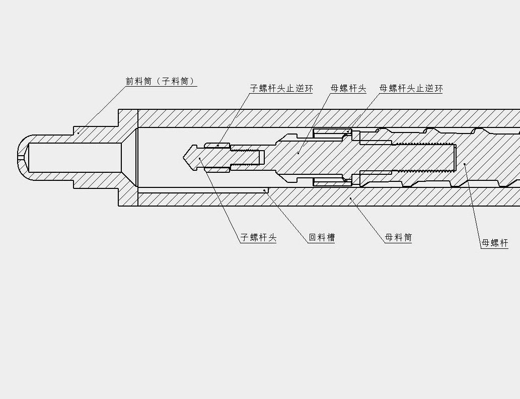 ????????6. 一些回料里面有很多杂质或加了碳酸钙,螺杆料筒比较容易磨损,只要把母螺杆加大专门设计成加料塑化螺杆,把子螺杆设计成注射螺杆如图7,会大大减少螺杆磨损