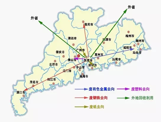 ????????目前,东莞市废纸主要在本地造纸厂回收利用;废塑料主要流向佛山等珠三角地区的塑料造粒加工企业;废钢铁主要运往韶关、湛江、省外城市等地区进行冶炼;废有色金属、废电子主要流向粤东进行回炉再用。