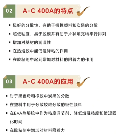 A-C 400A在EVA热熔胶行业中,有广泛应用,是的粘度调节剂。在配方中加入可以降低熔融粘度缩短固化时间,减少抽丝现象;可进一步改善热熔胶的流动性和润温性;可防止热熔胶存放结块及表面发粘,但用量过多会使胶接强度下降,一般地加入量不超过30%。