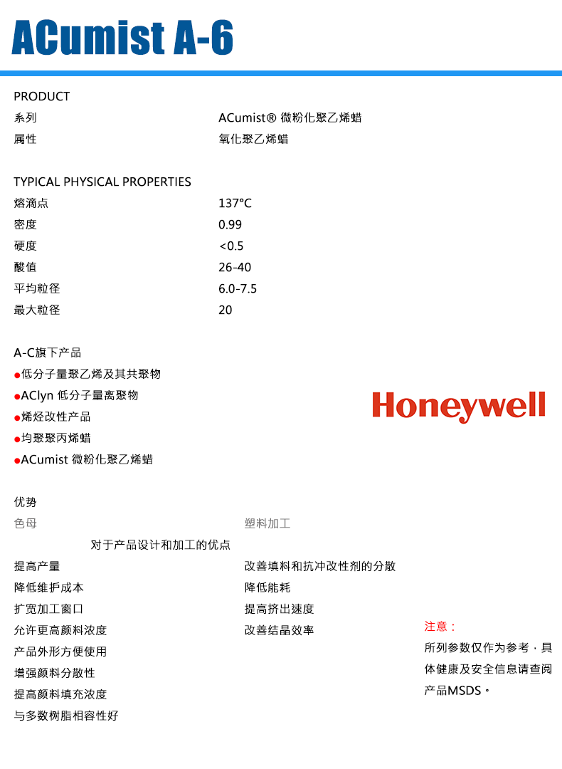 • 霍尼韦尔蜡粉 ACumist A-6 微粉化氧化聚乙烯蜡 物性表, 霍尼韦尔蜡粉 ACumist A-6 微粉化氧化聚乙烯蜡 产品参数,霍尼韦尔蜡粉 ACumist A-6 微粉化氧化聚乙烯蜡 性能表,霍尼韦尔蜡粉 ACumist A-6 微粉化氧化聚乙烯蜡 出厂报告, MSDS,, 物质安全资料表, UL黄卡,{ SGS报告, RoHS, 食品级认证, NSF饮用水标准, 产品资料, 产品性能, 出厂报告, 原厂原包, 代理商, 热变形温度, 熔指数, 流动系数, 抗冲击性能、冲击强度, 低温韧性、低温抗冲击性能, 熔体流动系数、熔体流动速率, 加工工艺、加工参数、加工温度, 欧盟RoHS 德国FDA 美国FDA 日本FDA