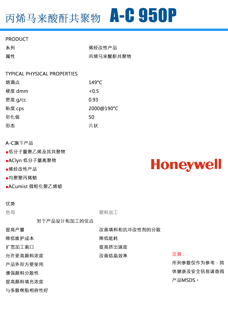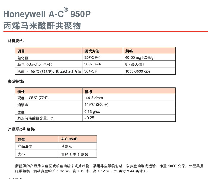 - 霍尼韦尔 honeywell 丙烯马来酸酐共聚物 A-C 950P 适用热熔胶电缆塑料改性 物性表, 霍尼韦尔 honeywell 丙烯马来酸酐共聚物 A-C 950P 适用热熔胶电缆塑料改性 产品参数,霍尼韦尔 honeywell 丙烯马来酸酐共聚物 A-C 950P 适用热熔胶电缆塑料改性 性能表,霍尼韦尔 honeywell 丙烯马来酸酐共聚物 A-C 950P 适用热熔胶电缆塑料改性 出厂报告, MSDS,, 物质安全资料表, UL黄卡,{ SGS报告, RoHS, 食品级认证, NSF饮用水标准, 产品资料, 产品性能, 出厂报告, 原厂原包, 代理商, 热变形温度, 熔指数, 流动系数, 抗冲击性能、冲击强度, 低温韧性、低温抗冲击性能, 熔体流动系数、熔体流动速率, 加工工艺、加工参数、加工温度, 欧盟RoHS 德国FDA 美国FDA 日本FDA