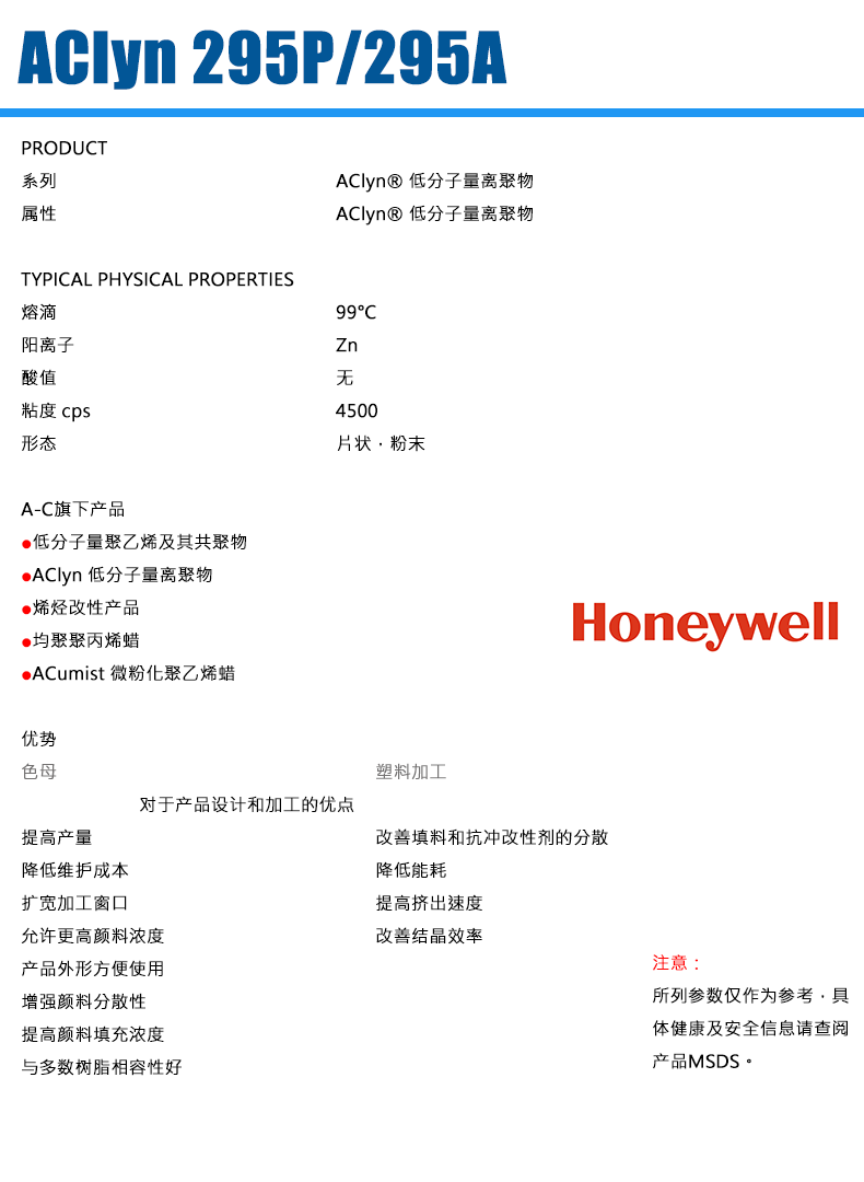 • Honeywell(霍尼韦尔) Acyln 295A低分子量离聚物 PBT尼龙成核剂 物性表, Honeywell(霍尼韦尔) Acyln 295A低分子量离聚物 PBT尼龙成核剂 产品参数,Honeywell(霍尼韦尔) Acyln 295A低分子量离聚物 PBT尼龙成核剂 性能表,Honeywell(霍尼韦尔) Acyln 295A低分子量离聚物 PBT尼龙成核剂 出厂报告, MSDS,, 物质安全资料表, UL黄卡,{ SGS报告, RoHS, 食品级认证, NSF饮用水标准, 产品资料, 产品性能, 出厂报告, 原厂原包, 代理商, 热变形温度, 熔指数, 流动系数, 抗冲击性能、冲击强度, 低温韧性、低温抗冲击性能, 熔体流动系数、熔体流动速率, 加工工艺、加工参数、加工温度, 欧盟RoHS 德国FDA 美国FDA 日本FDA