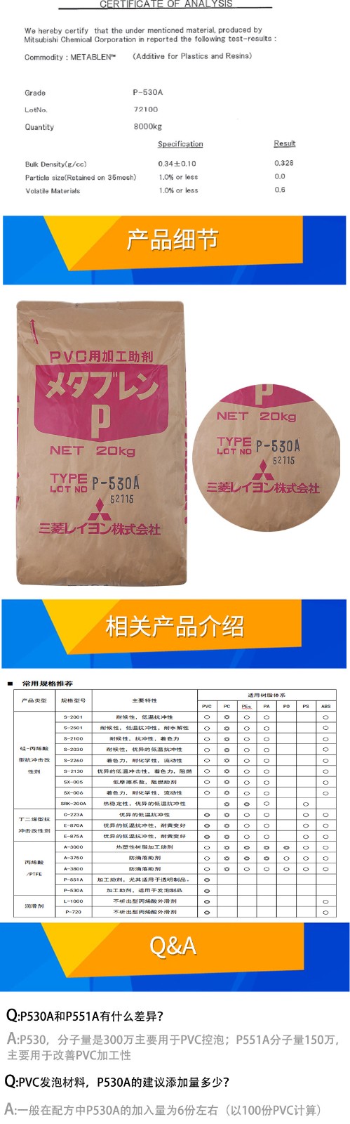 - P-530A日本三菱ACR增韧剂pvc助剂抗冲击剂树脂发泡改性剂 物性表, P-530A日本三菱ACR增韧剂pvc助剂抗冲击剂树脂发泡改性剂 产品参数,P-530A日本三菱ACR增韧剂pvc助剂抗冲击剂树脂发泡改性剂 性能表,P-530A日本三菱ACR增韧剂pvc助剂抗冲击剂树脂发泡改性剂 出厂报告, MSDS,, 物质安全资料表, UL黄卡,{ SGS报告, RoHS, 食品级认证, NSF饮用水标准, 产品资料, 产品性能, 出厂报告, 原厂原包, 代理商, 热变形温度, 熔指数, 流动系数, 抗冲击性能、冲击强度, 低温韧性、低温抗冲击性能, 熔体流动系数、熔体流动速率, 加工工艺、加工参数、加工温度, 欧盟RoHS 德国FDA 美国FDA 日本FDA