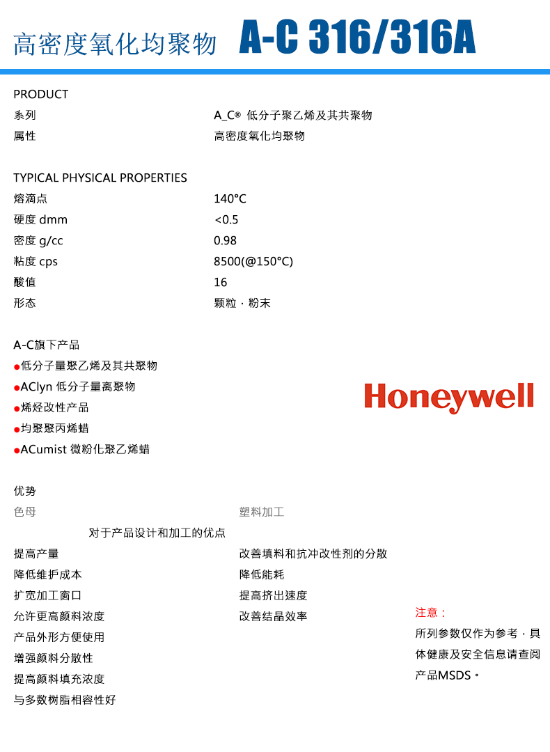 - 霍尼韦尔 Honeywell AC 316A 氧化高密度聚乙烯蜡 物性表, 霍尼韦尔 Honeywell AC 316A 氧化高密度聚乙烯蜡 产品参数,霍尼韦尔 Honeywell AC 316A 氧化高密度聚乙烯蜡 性能表,霍尼韦尔 Honeywell AC 316A 氧化高密度聚乙烯蜡 出厂报告, MSDS,, 物质安全资料表, UL黄卡,{ SGS报告, RoHS, 食品级认证, NSF饮用水标准, 产品资料, 产品性能, 出厂报告, 原厂原包, 代理商, 热变形温度, 熔指数, 流动系数, 抗冲击性能、冲击强度, 低温韧性、低温抗冲击性能, 熔体流动系数、熔体流动速率, 加工工艺、加工参数、加工温度, 欧盟RoHS 德国FDA 美国FDA 日本FDA