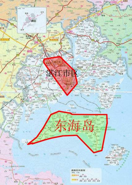 东海岛位于在中国雷州半岛东部,历史上属雷州府遂溪县辖岛。1958年东北大堤修建后方便了岛民出入,今属湛江市经济开发区,岛内主要通有东山、东简、民安3个街道办。地势东高西低,东为玄武岩台地,西为海积平原。东端距海滩2公里,有海拔111米高的龙水岭火山锥,面积500×500米,为火山碎屑岩及少量玄武岩构成,是天然航海陆标。蔚鶨港和北山港为岛内最大渔港。蔚鶨附近6.5公里岸线,水深26~40米,其中40米深水航道650米。岛内有尚待开发的土地40余万亩,地势平坦,标高4~14米,为地质坚硬的火成岩基地。地下水日开采量可达50万立方米。盛产鱼、盐,有庵里、红旗盐场,海水养殖 以鲍鱼和对虾著称。海滩绵长且洁白。