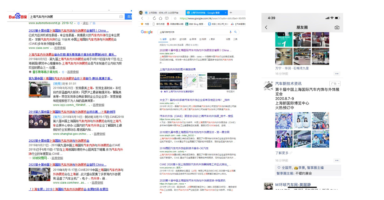 我们已经陆续上线抖音、今日头条、网易、新浪的信息流广告,通过精准用户画像让我们广告展现给目标行业人士, 目前曝光量达到了近1000万次,促进展商及观众对CIAIE汽车内外饰展会的全面了解。