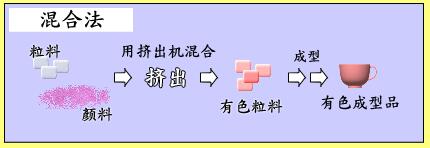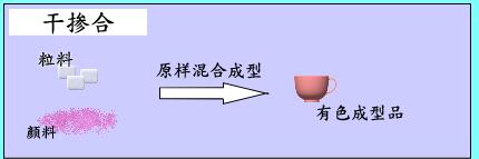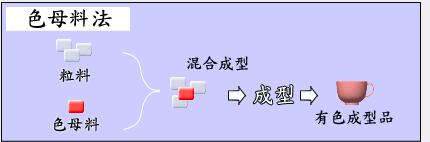 这种方法主要在注塑成型时,把颜色溶度高的有色母料混合到着色材料中,主要用于黑灰色产品着色。