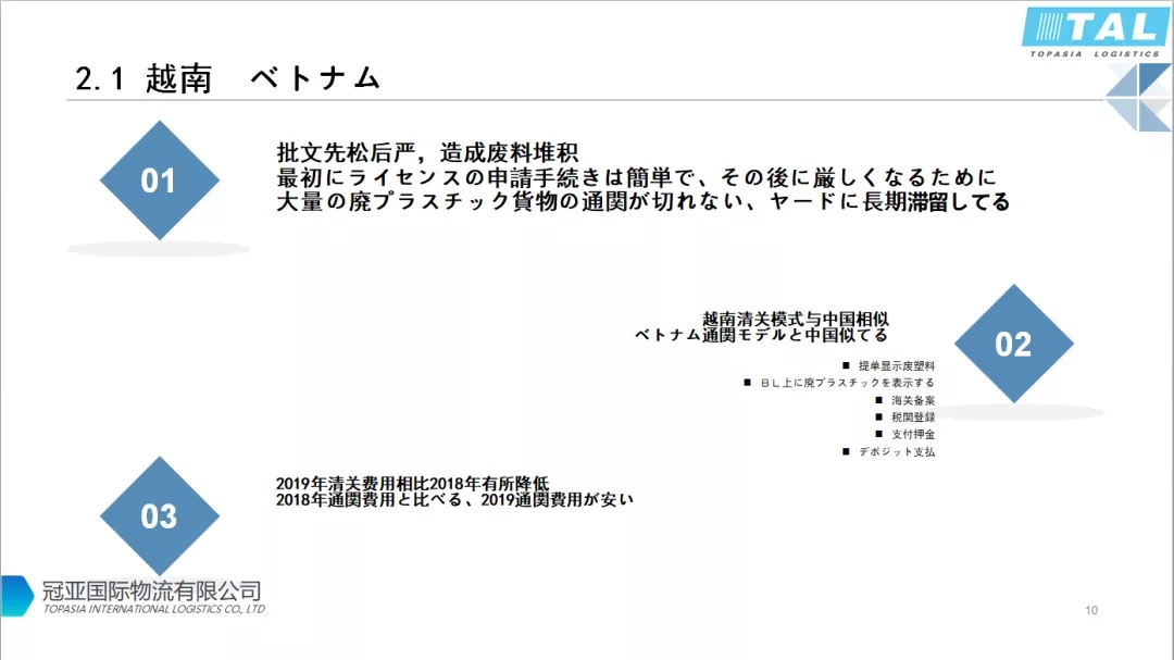 ????????有批文的还是可以正常清关,通关时间也很迅速。越南废料的清关模式跟之前中国很像,提单必须显示废塑料,收货人需要在海关备案,进口报关的时间需要支付押金。现在问题是只有少数几家船公司愿意接去越南的货。相比2018年的情况,2019年下半年陆续出来很多新的批文,清关费用也在逐步降低。