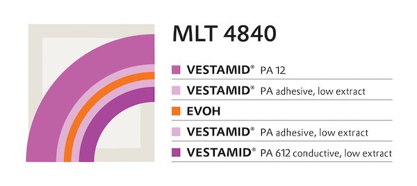 ????????MLT 4840的特殊之处在于,它的内层不是由含氟聚合物制成,而是由导电、低淬取性的VESTAMID聚酰胺612制成。因此,该系统非常适合使用挤出工艺加工,即使在与酒精长期接触后也有优异的抗静电性能。