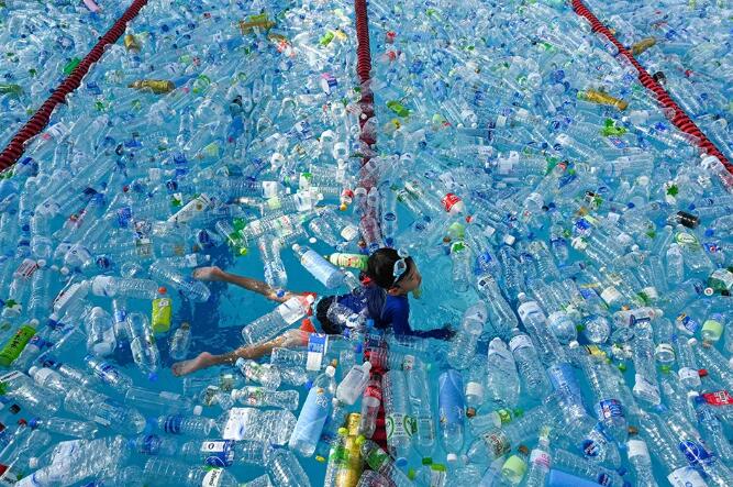 当地时间2019年6月8日,泰国曼谷,民众在装满塑料瓶的游泳池里游泳,以纪念世界海洋日,警醒塑料污染。 (视觉中国/图)
