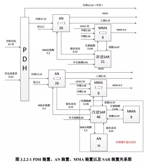 ????????根据全厂总加工流程,本项目丙烷脱氢单元主要生产优质、低成本的丙烯单体,为下游丙烯腈单元提供原料,多余丙烯产品外销;丙烯腈单元生产丙烯腈产品,副产 HCN 送入 MMA单元作为原料,副产废酸进入 SAR 循环处理再利用;MMA 单元生产 MMA 产品,副产废酸进入 SAR 循环处理再利用(本次新建 SAR 装置与厂内已经 SAR 工艺相同,改建 SAR 装置使用纯氧,其他工艺不变)。