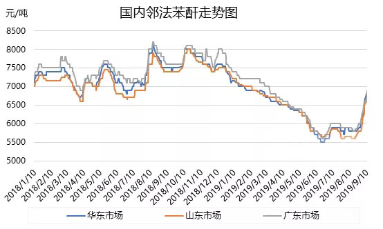 ????????如上图所示,为苯酐行业价格走势图,价格呈现飙涨,且仍有涨势预期。苯酐涨势主要推动力在于原料邻苯缺货。邻苯现货供应紧缺,一方面是进口货源寥寥,另一方面国内邻苯装置因素,影响邻苯产量,目前中石化邻苯价格上调至6500元/吨自提,相较于码头方面听闻交投价格7300元/吨,及苯酐触及7000元/吨价格,预计石化邻苯仍有上调空间。鉴于邻苯缺货,苯酐厂家采购不到足够邻苯,加之环保等因素影响,开工不足,导致供不应求,价格不断上扬。萘法苯酐亦是积极跟涨,货少及工业萘走势上行释放利好,北方价格涨至6400元/吨自提,与邻法苯酐价格6800元/吨,价差空间不大,预计苯酐行业仍有涨势空间,为DOP、DBP行业提供强劲成本支撑。