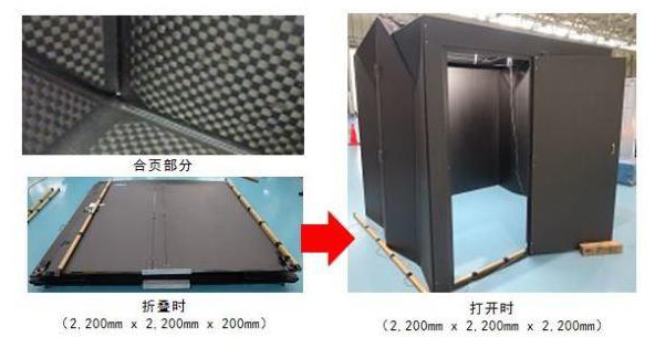 ????????该试制品是在CFRP(碳纤维复合材料)制的面板上贴合GFRP(玻璃纤维复合材料)合页制成的约11m3的简易型小房间,约40kg,因其十分轻量,无需使用大型机械和工具,两个成人即可简单搭建。