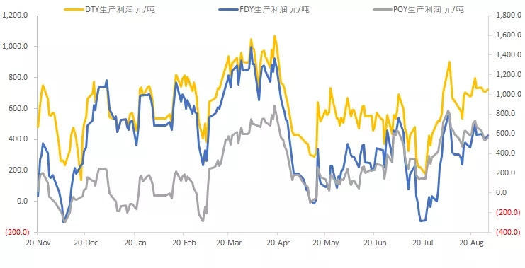????????最近聚酯产业链下游利润和开工率齐升,说明终端对聚酯的需求还不错,上游让渡的利润也盘活了下游企业。长丝的产销最近也有所回升,8月份平均产销率为83%,基本上与去年同期持平,反观7月份的平均产销率只有55%,8月份下游真的是有很大起色,但是上游PTA毫无起色。