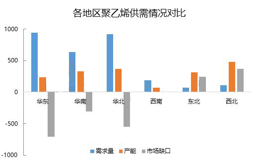 ????????近年国内产能的不断增加,各地区供需情况也有所改变。东北地区是我国老工业基地,是中油系统装置集中地区,东北地区下游需求占国内需求占比较小,是国内PE产品输出型地区。另外,西北地区依托丰富的煤炭资源,近年煤制装置搞通文化路,西北地区产能快速增长。西北地区同东北地区一样,产能分布集中,但下游需求较少,也是我国主要的PE产品输出地。国内主要的下游需求地区为华东地区、华南地区和华北地区。其中,最大的消费地区为华东地区,华东地区聚乙烯消费点全国总消费量的三分之一左右,但华东地区当地拥有的产能有限,占全国总产能的13%。华东地区年PE消费量在900万吨以上,进口产品充斥华东市场?;蚴荘E产品最大的净流入地区,随着国际与国内的快速扩能,华东地区是进口产品与国产产品必争之地,价格竞争也将进入白热化状态,未来华东地区很可能成为国内价格洼地,进口低价产品对市场价格冲击明显。华北地区与华南地区作为主要的消费地区,情况与华东地区相类似,是国内外PE产品的主要消费目的地,来自供应端的压力不断增加,市场竞争日益加剧。
