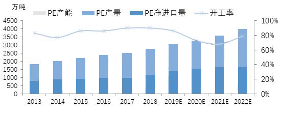 ????????PE国内产能不断扩增的同时,国际PE产能同样快速增长,尤其近年来北美及中东地区以轻烃为原料的PE装置快速投产,我国是国际PE产品主要消费国,国际PE产品的主要消费目的地,导致我国PE进口量仍保持快速增长。近年PE进口依存度仍保持在50%左右。进口PE产品依托其成本价格优势,在国内仍占有一席之地,预计PE进口依存度下降缓慢。2019年国内PE表观需求量预计在3270万吨左右,产量将达到1745万吨,进口量在1550万吨左右,国内PE进口依存度约在49%左右。随着国内PE新增产能陆续释放,预计2020-2022年国内PE装置开工率或有所下降。
