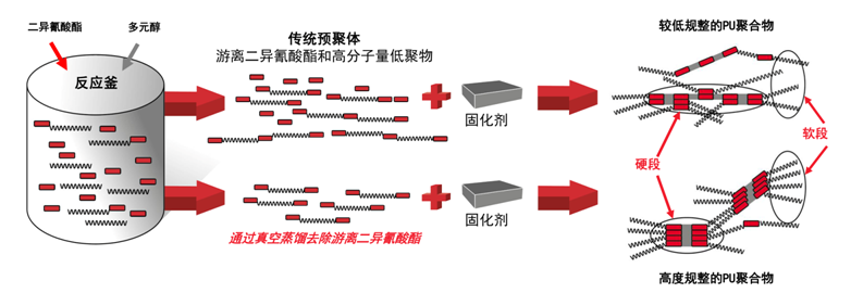 与相当的常规预聚体相比,采用低游离预聚体生产的聚氨酯产品在硬段和软段之间具有更彻底的相分离、更窄的分子量分布和更高的交联度,从而使最终产品具有更优异的性能。