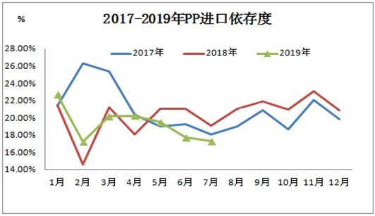 ????????由2017-2019年PP进口依存度发现,2019年4月份进口依存度开始逐步下挫,7月进口依存度同比下降1.82%,环比下降0.42%。由此数据可发现进口PP产品在国内依存度呈现逐步下降趋势。其实这与国内PP产能激增密不可分,进口PP产品由于整体价高,在国内市场竞争优势逐步减弱,除部分高端专用产品在下游仍占据优势外,按照目前国内PP扩能计划逐步实现,进口PP在国内依存度有进一步下降趋势。