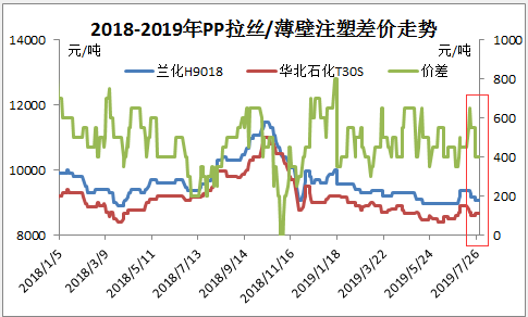 ????????从上图可以看出,7月份,PP拉丝料/薄壁注塑料价差开始出现缩小趋势。6月底7月初,薄壁注塑料和拉丝料价差在600元/吨左右,7月底,价差缩小至400元/吨,在利润方面一直占有优势的薄壁注塑料,开始逐渐走下神坛。
