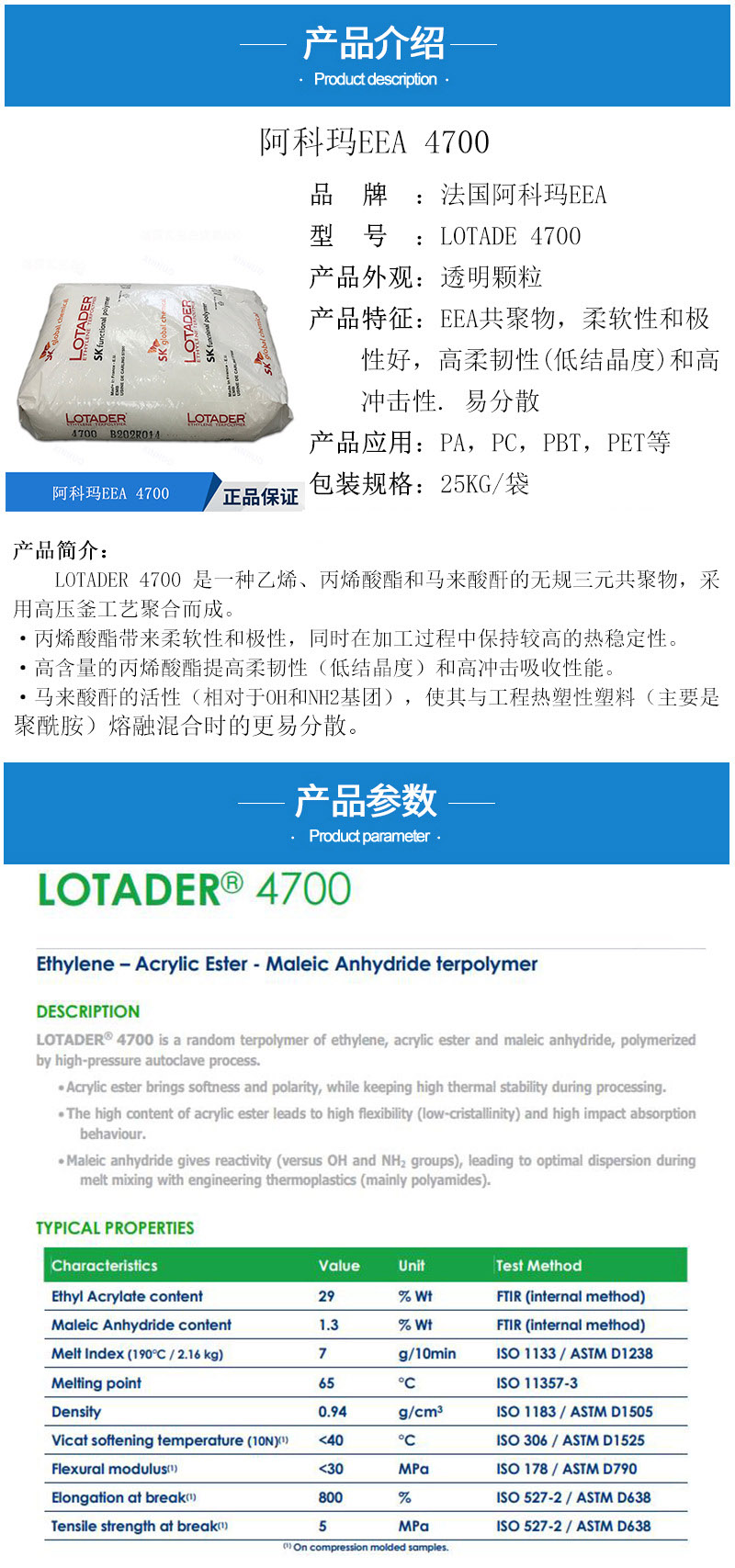 • Lotader EEA 法国阿科玛 4700 MAH 三元共聚物 高抗冲 热稳定性 物性表, Lotader EEA 法国阿科玛 4700 MAH 三元共聚物 高抗冲 热稳定性 产品参数,Lotader EEA 法国阿科玛 4700 MAH 三元共聚物 高抗冲 热稳定性 性能表,Lotader EEA 法国阿科玛 4700 MAH 三元共聚物 高抗冲 热稳定性 出厂报告, MSDS,, 物质安全资料表, UL黄卡,{ SGS报告, RoHS, 食品级认证, NSF饮用水标准, 产品资料, 产品性能, 出厂报告, 原厂原包, 代理商, 热变形温度, 熔指数, 流动系数, 抗冲击性能、冲击强度, 低温韧性、低温抗冲击性能, 熔体流动系数、熔体流动速率, 加工工艺、加工参数、加工温度, 欧盟RoHS 德国FDA 美国FDA 日本FDA