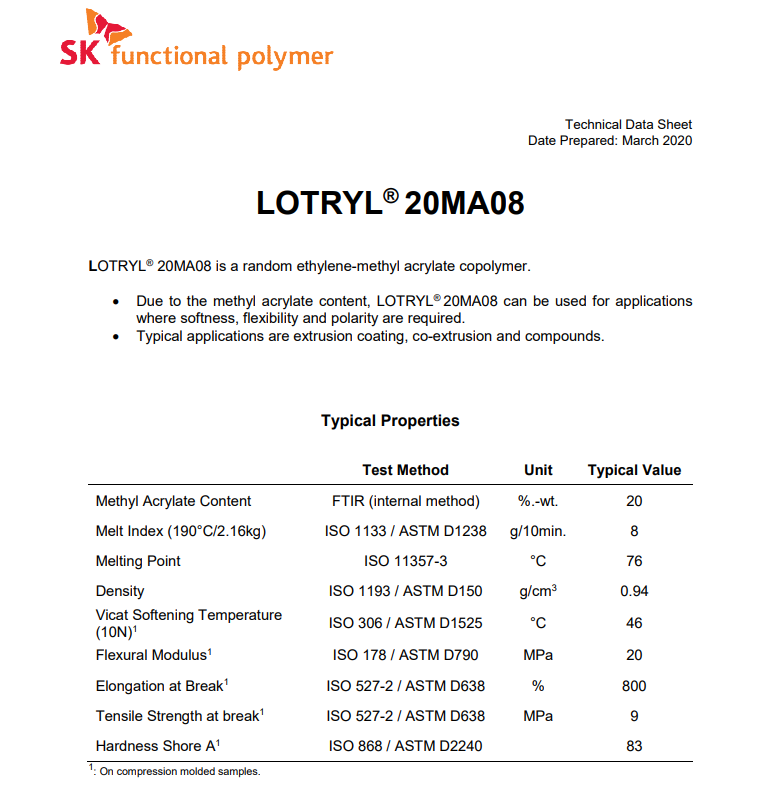 - 阿科玛增韧剂相容剂EMA Lotryl 20MA08 物性表, 阿科玛增韧剂相容剂EMA Lotryl 20MA08 产品参数,阿科玛增韧剂相容剂EMA Lotryl 20MA08 性能表,阿科玛增韧剂相容剂EMA Lotryl 20MA08 出厂报告, MSDS,, 物质安全资料表, UL黄卡,{ SGS报告, RoHS, 食品级认证, NSF饮用水标准, 产品资料, 产品性能, 出厂报告, 原厂原包, 代理商, 热变形温度, 熔指数, 流动系数, 抗冲击性能、冲击强度, 低温韧性、低温抗冲击性能, 熔体流动系数、熔体流动速率, 加工工艺、加工参数、加工温度, 欧盟RoHS 德国FDA 美国FDA 日本FDA