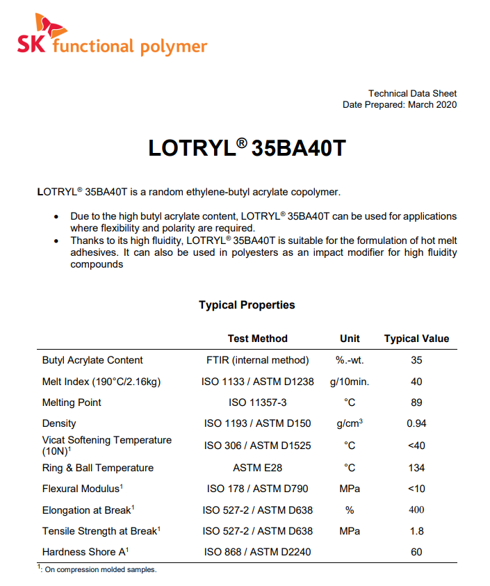 - EBA 法国阿科玛 35BA40T 物性表, EBA 法国阿科玛 35BA40T 产品参数,EBA 法国阿科玛 35BA40T 性能表,EBA 法国阿科玛 35BA40T 出厂报告, MSDS,, 物质安全资料表, UL黄卡,{ SGS报告, RoHS, 食品级认证, NSF饮用水标准, 产品资料, 产品性能, 出厂报告, 原厂原包, 代理商, 热变形温度, 熔指数, 流动系数, 抗冲击性能、冲击强度, 低温韧性、低温抗冲击性能, 熔体流动系数、熔体流动速率, 加工工艺、加工参数、加工温度, 欧盟RoHS 德国FDA 美国FDA 日本FDA