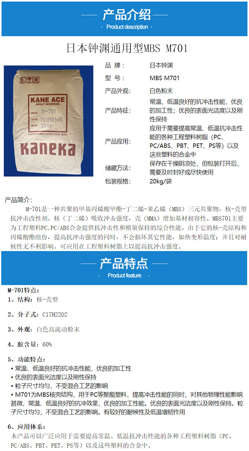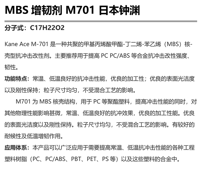 • 日本钟渊MBS M701增韧剂 PC/ABS合金抗冲击剂 增韧改性钟渊mbs701 物性表, 日本钟渊MBS M701增韧剂 PC/ABS合金抗冲击剂 增韧改性钟渊mbs701 产品参数,日本钟渊MBS M701增韧剂 PC/ABS合金抗冲击剂 增韧改性钟渊mbs701 性能表,日本钟渊MBS M701增韧剂 PC/ABS合金抗冲击剂 增韧改性钟渊mbs701 出厂报告, MSDS,, 物质安全资料表, UL黄卡,{ SGS报告, RoHS, 食品级认证, NSF饮用水标准, 产品资料, 产品性能, 出厂报告, 原厂原包, 代理商, 热变形温度, 熔指数, 流动系数, 抗冲击性能、冲击强度, 低温韧性、低温抗冲击性能, 熔体流动系数、熔体流动速率, 加工工艺、加工参数、加工温度, 欧盟RoHS 德国FDA 美国FDA 日本FDA