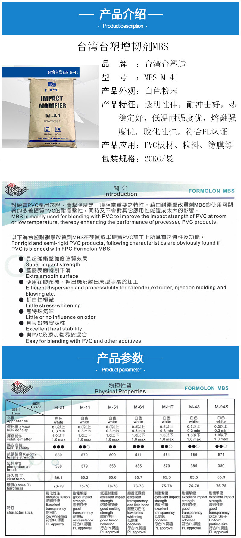 - 增韧剂M-41 透明 耐油级 低温抗冲击 PVC热稳定 MBS台塑M41 物性表, 增韧剂M-41 透明 耐油级 低温抗冲击 PVC热稳定 MBS台塑M41 产品参数,增韧剂M-41 透明 耐油级 低温抗冲击 PVC热稳定 MBS台塑M41 性能表,增韧剂M-41 透明 耐油级 低温抗冲击 PVC热稳定 MBS台塑M41 出厂报告, MSDS,, 物质安全资料表, UL黄卡,{ SGS报告, RoHS, 食品级认证, NSF饮用水标准, 产品资料, 产品性能, 出厂报告, 原厂原包, 代理商, 热变形温度, 熔指数, 流动系数, 抗冲击性能、冲击强度, 低温韧性、低温抗冲击性能, 熔体流动系数、熔体流动速率, 加工工艺、加工参数、加工温度, 欧盟RoHS 德国FDA 美国FDA 日本FDA