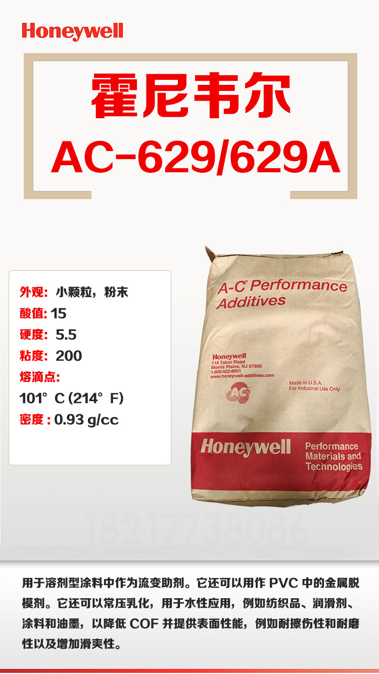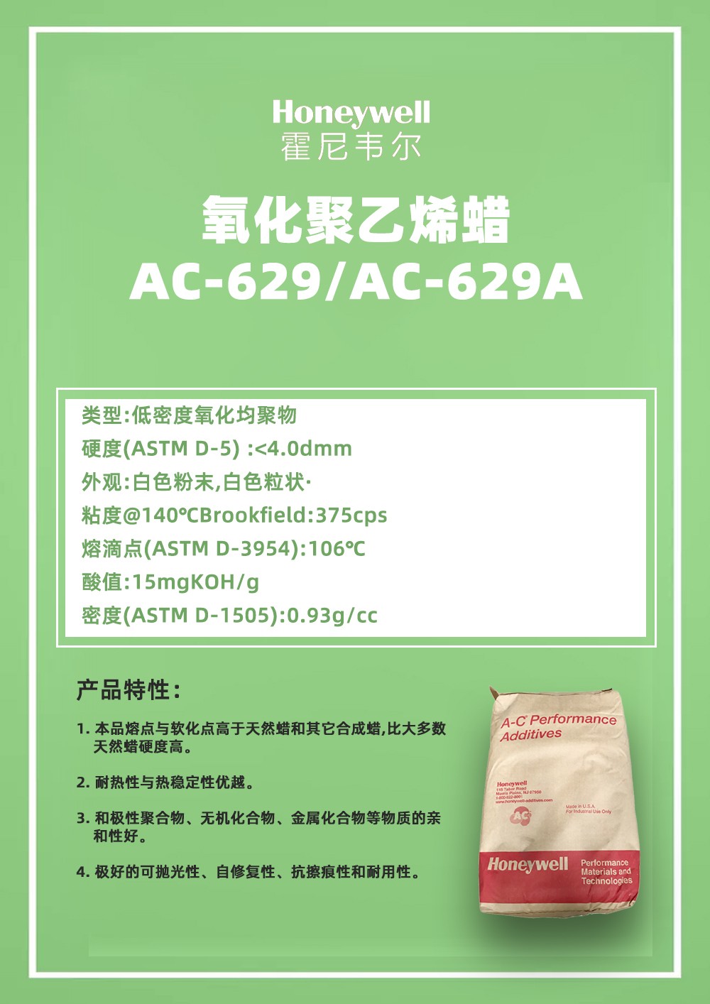 - Honeywell 霍尼韦尔氧化聚乙烯蜡A-C629A蜡粉 物性表, Honeywell 霍尼韦尔氧化聚乙烯蜡A-C629A蜡粉 产品参数,Honeywell 霍尼韦尔氧化聚乙烯蜡A-C629A蜡粉 性能表,Honeywell 霍尼韦尔氧化聚乙烯蜡A-C629A蜡粉 出厂报告, MSDS,, 物质安全资料表, UL黄卡,{ SGS报告, RoHS, 食品级认证, NSF饮用水标准, 产品资料, 产品性能, 出厂报告, 原厂原包, 代理商, 热变形温度, 熔指数, 流动系数, 抗冲击性能、冲击强度, 低温韧性、低温抗冲击性能, 熔体流动系数、熔体流动速率, 加工工艺、加工参数、加工温度, 欧盟RoHS 德国FDA 美国FDA 日本FDA