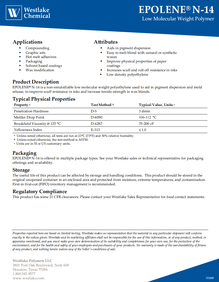 - 美国西湖化学WESTLAKEN14 聚乙烯蜡 N-14 物性表, 美国西湖化学WESTLAKEN14 聚乙烯蜡 N-14 产品参数,美国西湖化学WESTLAKEN14 聚乙烯蜡 N-14 性能表,美国西湖化学WESTLAKEN14 聚乙烯蜡 N-14 出厂报告, MSDS,, 物质安全资料表, UL黄卡,{ SGS报告, RoHS, 食品级认证, NSF饮用水标准, 产品资料, 产品性能, 出厂报告, 原厂原包, 代理商, 热变形温度, 熔指数, 流动系数, 抗冲击性能、冲击强度, 低温韧性、低温抗冲击性能, 熔体流动系数、熔体流动速率, 加工工艺、加工参数、加工温度, 欧盟RoHS 德国FDA 美国FDA 日本FDA