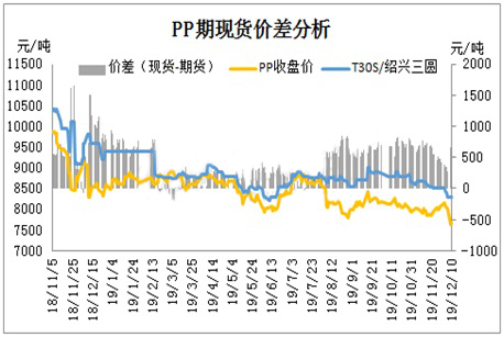 2019年12月库存显示整体呈现震荡下滑趋势,整体库存维持在60-70万吨/年,但全球经济偏弱运行及国内实体企业订单力度不及预期,市场原料消耗力度受到制约。同时2019年PP新一轮扩能高峰期再次来临,浙江石化及大连恒力等大型聚烯烃装置落地试运行,市场供需压力更加凸显,加快现货市场拉丝下挫压力。