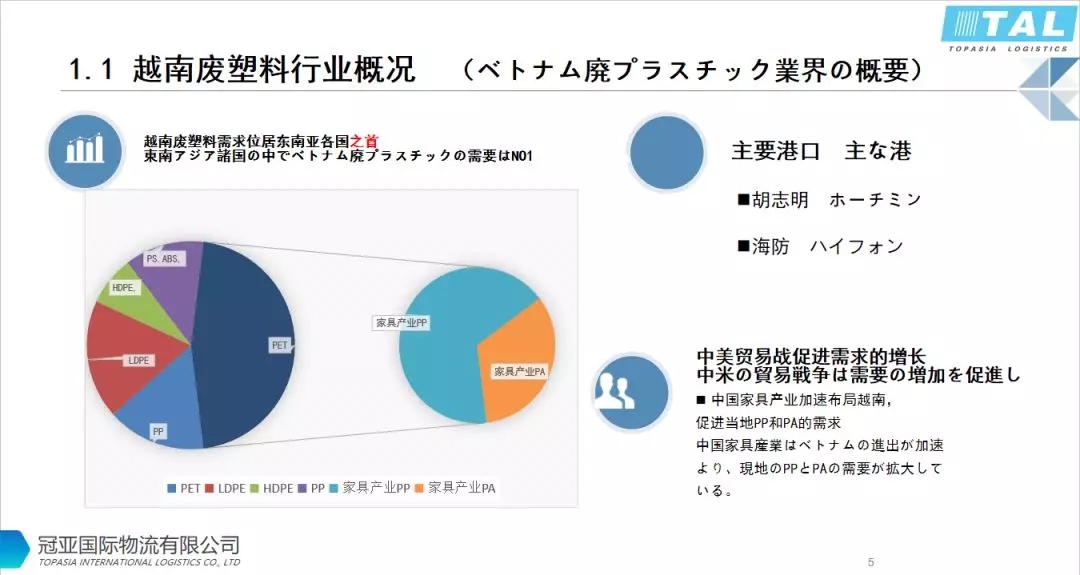 越南废塑料需求位居东南亚各国之首,再生塑料在越南的市场有PET,PP,PE,PS,ABS,PA。主要进口港口:海防,胡志明。