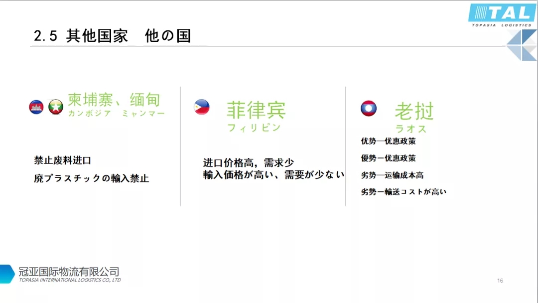 菲律宾码头拥挤,国内安全环境堪忧,再生资源的利用规模非常小。进口成本比泰国还高约3500美金/柜,废塑料企业很难生存。