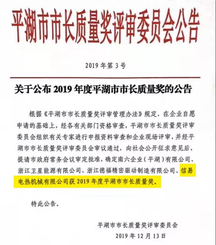 平湖市市长质量奖是平湖市人民政府设立的最高质量奖项,由平湖市政府表彰和奖励,每年度评审一次,每届不超过5个。该奖项旨在发挥市长质量奖的导向作用,推动企业实施卓越绩效模式和先进质量管理方法,深入开展质量管理创新、质量强企创建活动,树立质量标杆,加强典型示范,加快推进质量强市建设,促进经济转型升级。平湖信易2019年度获此殊荣,深感荣幸,同时亦感到责任之深重,今后信易将继续在精益管理,保证质量,做好品牌等方面努力进取,追求卓越,为塑胶辅机行业做出更大的贡献。