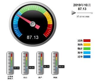 分项景气指数中,利润景气指数环比回升,营收、出口、资产景气指数环比下降,其中:营业收入景气指数85.54,位于“渐冷”区间,较9月下降0.01点;出口景气指数为86.66,位于“渐冷”区间,较9月下降3.59点;资产景气指数为90.19,位于“稳定”区间,较9月下降0.97点;利润景气指数89.91,位于“渐冷”区间,较9月回升0.82点。