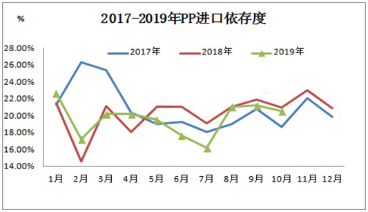 2019年PP进口依赖度呈现偏弱震荡局势,2019年1-10月进口总量2099.19万吨,较2018年1-10月份(总量1958.87万吨)增加140.32万吨,增幅7.16%。因国内受环保严查,对进口废旧塑料实行严格禁止后,国内对PP原料需求相应增加,部分进口资源相应增加,以填补国内需求。但PP进口整体依赖度呈现逐步下降趋势,目前2019年进口依赖度平均值在19.63%,可见伴随国内产能不断激增,部分国产料逐步替代进口产品,进口依赖度也相应下降。