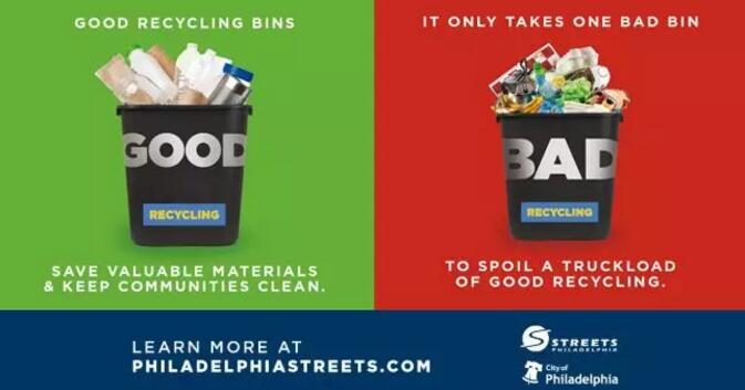 今年夏天,美国费城在巴士候车站和广播中投放广告,让人们不要把塑料袋扔到可回收垃圾箱里,“在把垃圾扔进垃圾箱前先花一分钟(想想)”,“如果有疑问就不要扔进去”。