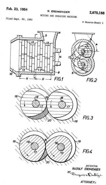 ????????1950年代,有了数年的研究积累,W. Meskat和R. Erdmenger等人把双螺杆挤出机的一些关键性参数进行定义并整理,使挤出机的理论研究走向规范化。下为数篇专利中的一篇,可以看出,当时的挤出机已经以单头元件为主,专利中还公开了啮合元件的应用。