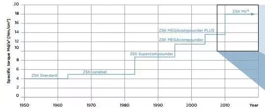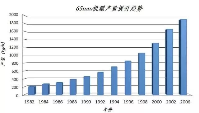 ????????由图可以看到,以65mm机型为例,从1980s到2000s,将近20年时间里产量提升了近10倍。比扭矩从ZSK第一代的4Nm/d3已发展到18+ Nm/d3,大小径比从1.22提高到1.80,物料的平均停留时间也由数十分钟降低到了仅仅数十秒。