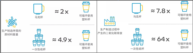 研究数据显示:以一个普通大小的杯子为例,可循环使用的塑料杯对比马克杯和一次性纸杯,无论在生产过程中的原材料损耗还是二氧化碳排放都占据优势。