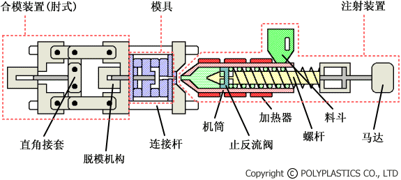 注塑成型机器可以分为两种装置:分别为合模装置与注射装置。