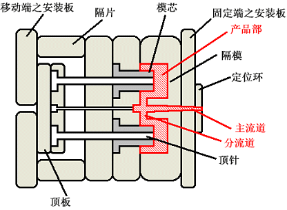 成型品是由熔融树脂进入的主流道,引导熔融树脂进入模腔的分流道及制品所构成的。