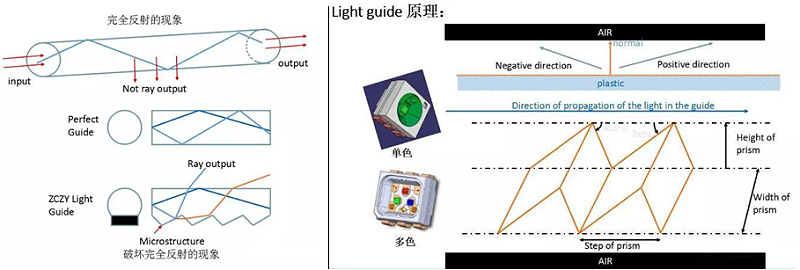 光通过圆形或其它特定形状透明材质时,会发生全反射现象。如果我们破坏完全反射条件,使光从透明材质表面流出,在汽车领域称为光导(Light Guide)。